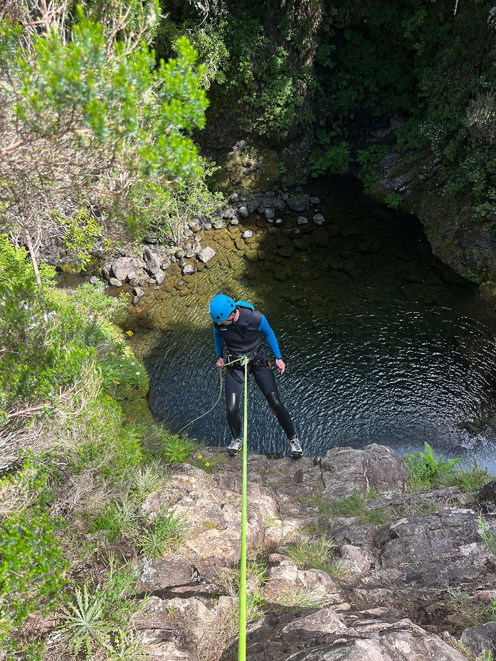 Entre a caminhada e os rapeis teremos alguns saltos para piscinas naturais de agua cristalina, onde o mais alto atinge os 12 metros (salto opcional).